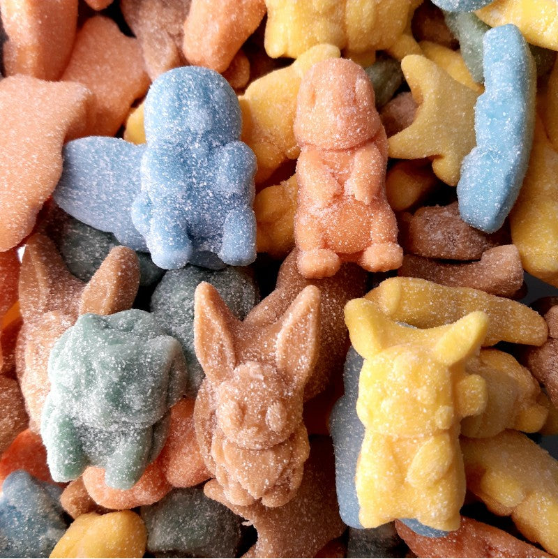 Ces bonbons Lutti sont des reproductions de Pikachu, Salamèche, Bulbizarre, Evoli, Carapuce, les personnages dans Pokémon. Ils sont colorés et parfumés aux fruits par des substances naturellement authentiques comme le carthame, la patate douce, la pomme, le citron, la curcumine.